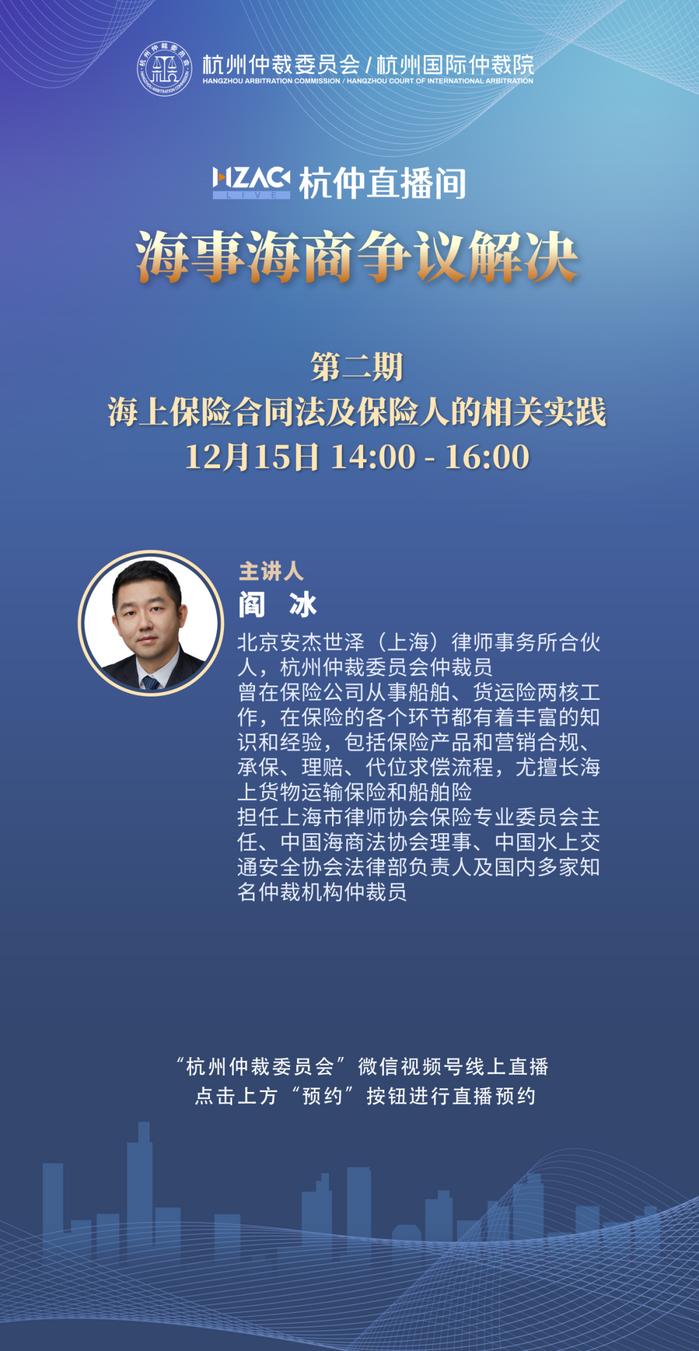 2025年12月15日,“海事海商争议解决”第二期“海上保险合同法及保险人的相关实践”线上公开课顺利举行。本期线上公开课由北京安杰世泽(上海)律师事务所合伙人,杭州仲裁委员会仲裁员阎冰担任主讲人。